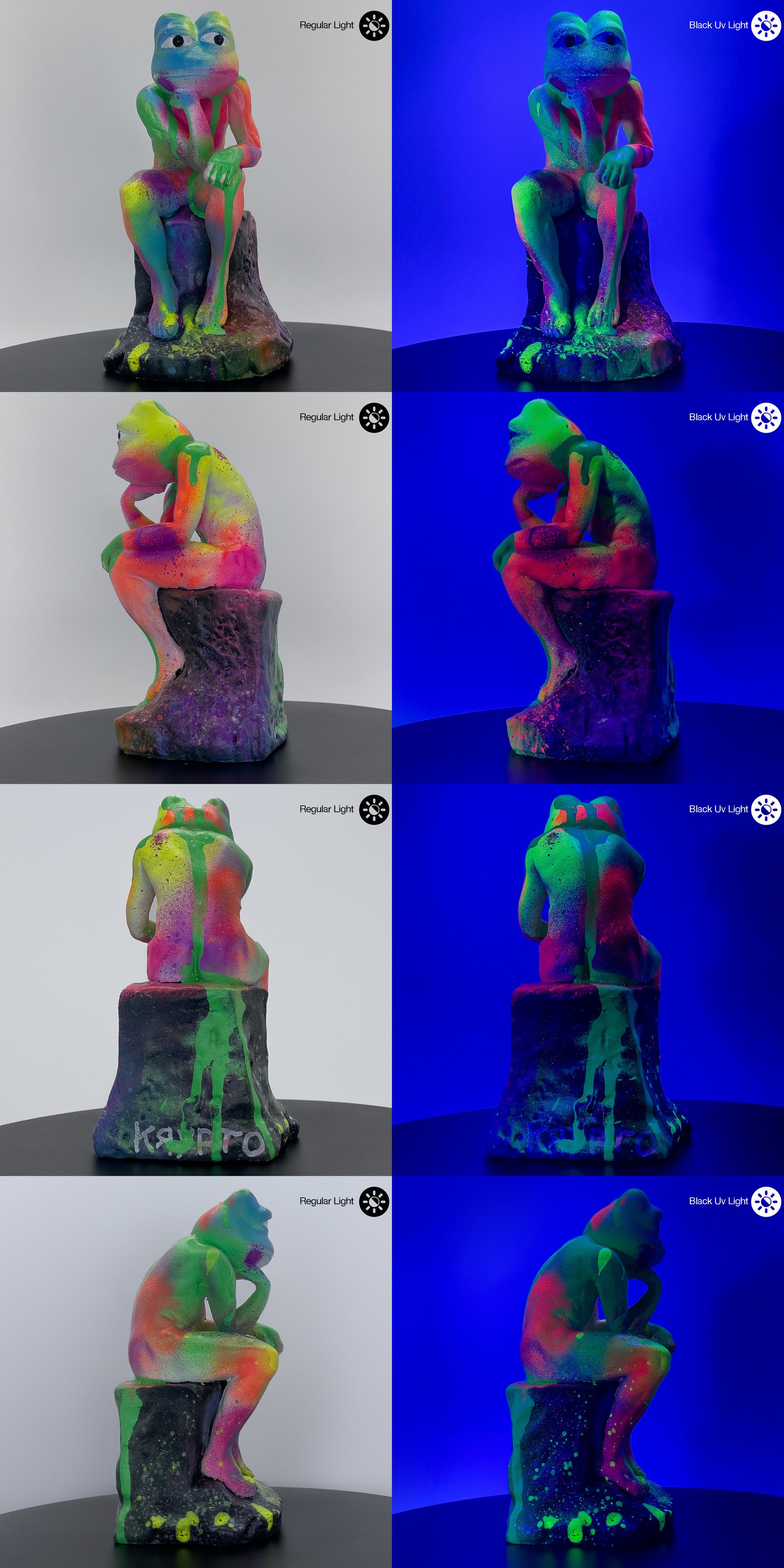 Hand-painted Pepe the Frog “The Thinker” resin statue with fluorescent acrylics that glow under UV light. Includes black UV flashlight and signed Certificate of Authenticity. Perfect for Pepe lovers, meme fans, UV art enthusiasts, and figurine/statue collectors.